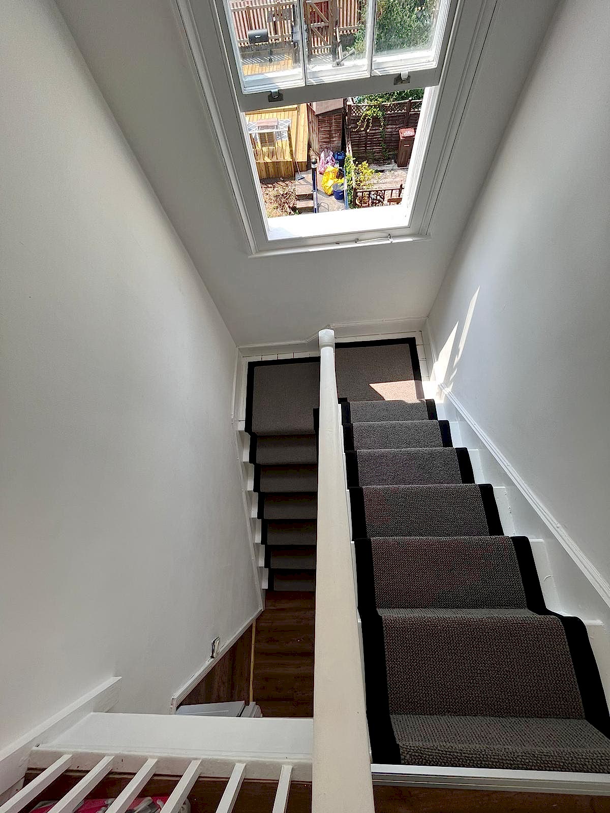 This is a stair runner project with tapped edges. The carpet is 100% wool.